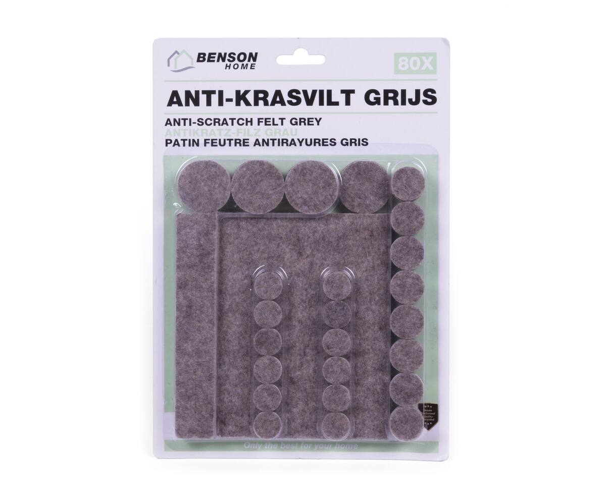 Bescherm je vloeren en geniet van meer rust in huis met onze antikrasvilt set van 80 stuks. Een essentiële toevoeging aan elk huis dat op zoek is naar stijlvolle en praktische oplossingen voor vloerbescherming en geluidsdemping.