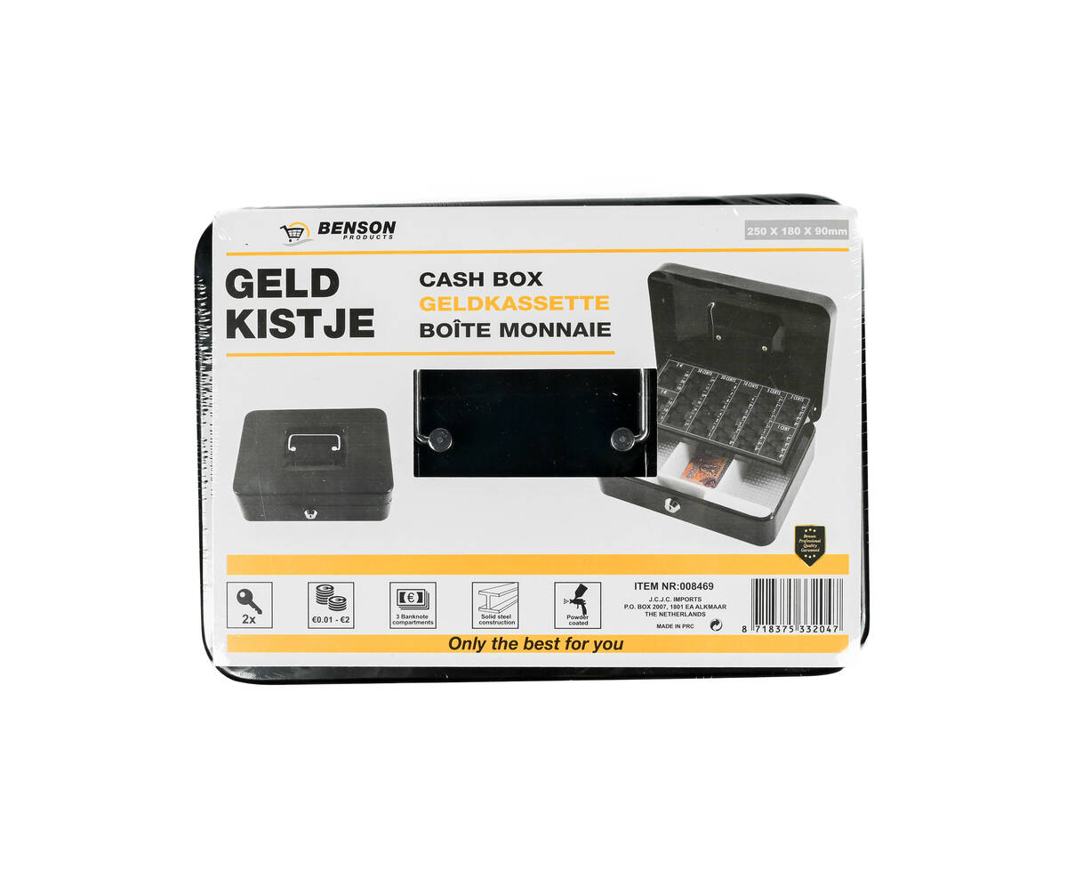 Houd uw geld en munten veilig en georganiseerd met onze hoogwaardige Geldkist Zwart. Deze robuuste geldkist is perfect voor zowel persoonlijk als professioneel gebruik. Dankzij de compacte afmetingen van 250 x 180 x 90 mm is deze gemakkelijk op te bergen en mee te nemen.