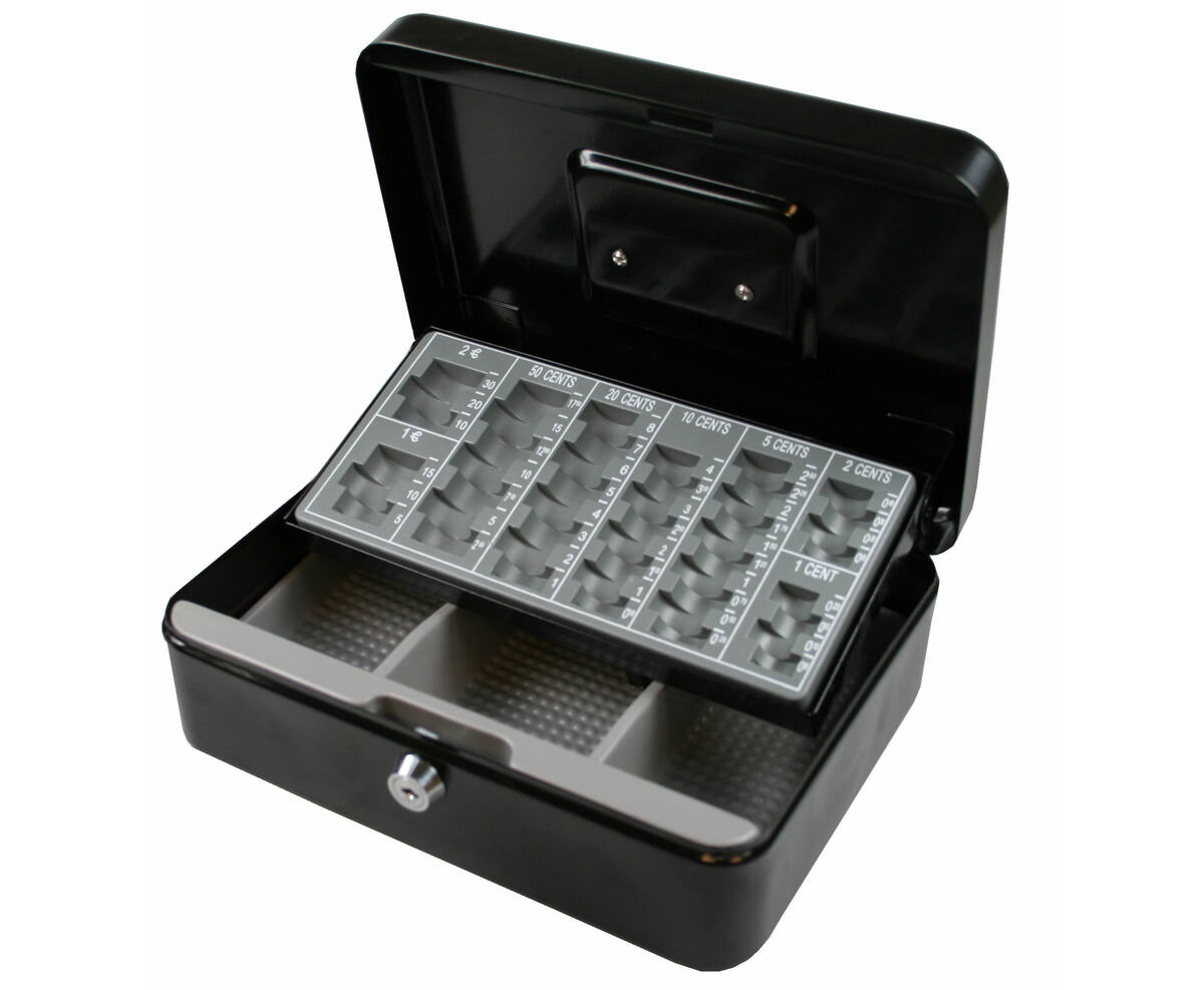 Onze geldkist is gemaakt van stevig metaal en heeft een duurzame zwarte afwerking die bestand is tegen slijtage. De geïntegreerde muntinzet zorgt ervoor dat uw munten netjes gesorteerd en gemakkelijk toegankelijk zijn. Of u nu thuis of op kantoor bent, deze geldkist biedt betrouwbare bescherming voor uw contant geld.