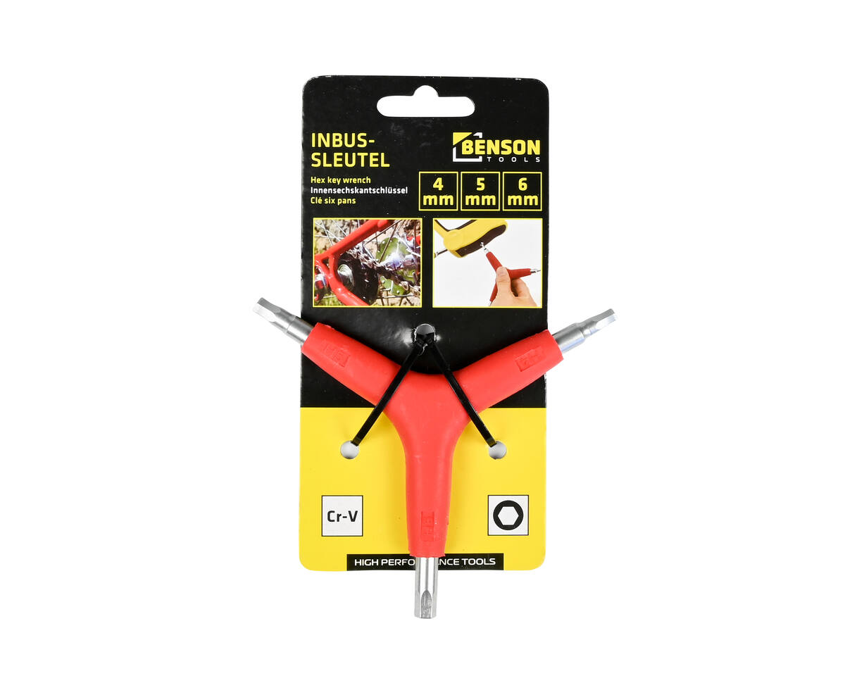 Ontdek de veelzijdigheid en het gemak van onze Inbus Sleutel 3 Weg met maten van 4 mm, 5 mm en 6 mm. Deze onmisbare tool is een must-have voor elke klusser, fietsenmaker en doe-het-zelver. Of u nu bezig bent met het in elkaar zetten van meubels, het onderhouden van uw fiets of het uitvoeren van kleine reparaties, deze inbussleutel biedt u de perfecte oplossing.