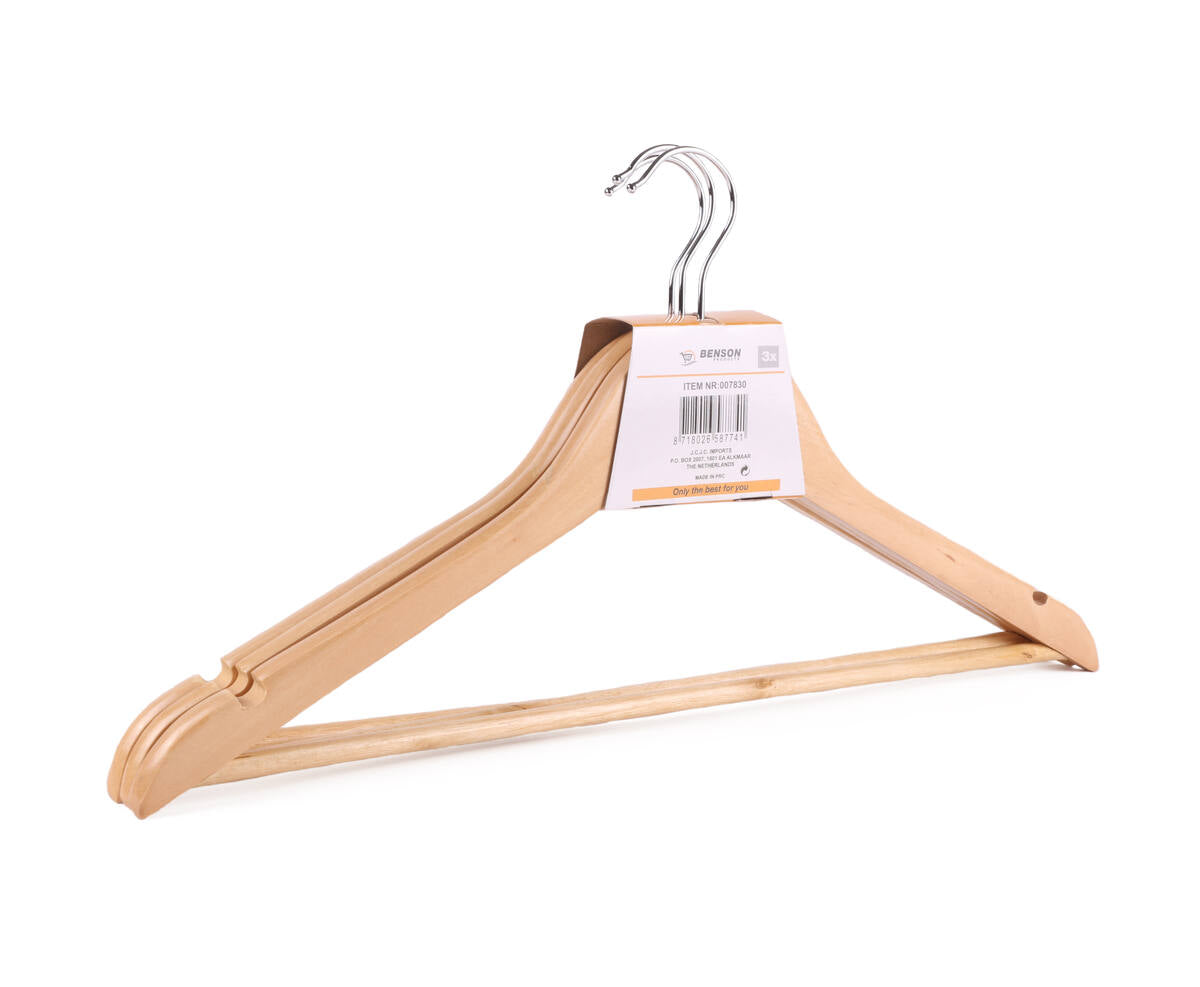 Organiseer je kledingkast met onze hoogwaardige houten kledinghangers. Deze set van drie kledinghangers is ideaal voor het netjes en stijlvol ophangen van al je favoriete kledingstukken.
