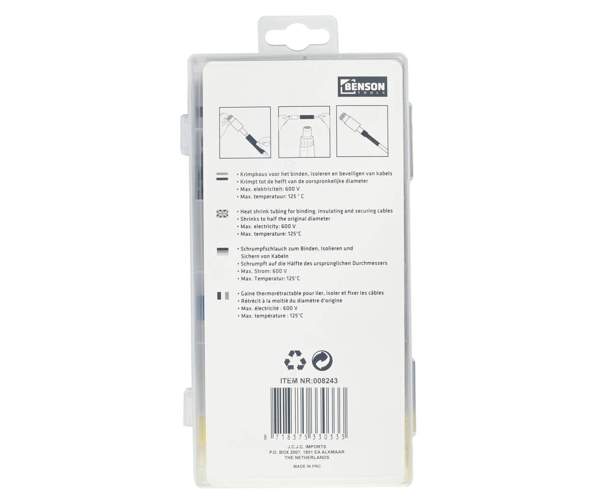 Onze krimpkous is ideaal voor een breed scala aan toepassingen. Of u nu kabels in uw huis, werkplaats of voertuig moet organiseren, deze krimptubes zorgen voor een nette en veilige afwerking. Met een krimpverhouding van 2:1 krimpen ze tot de helft van hun oorspronkelijke diameter, wat zorgt voor een strakke en veilige pasvorm.