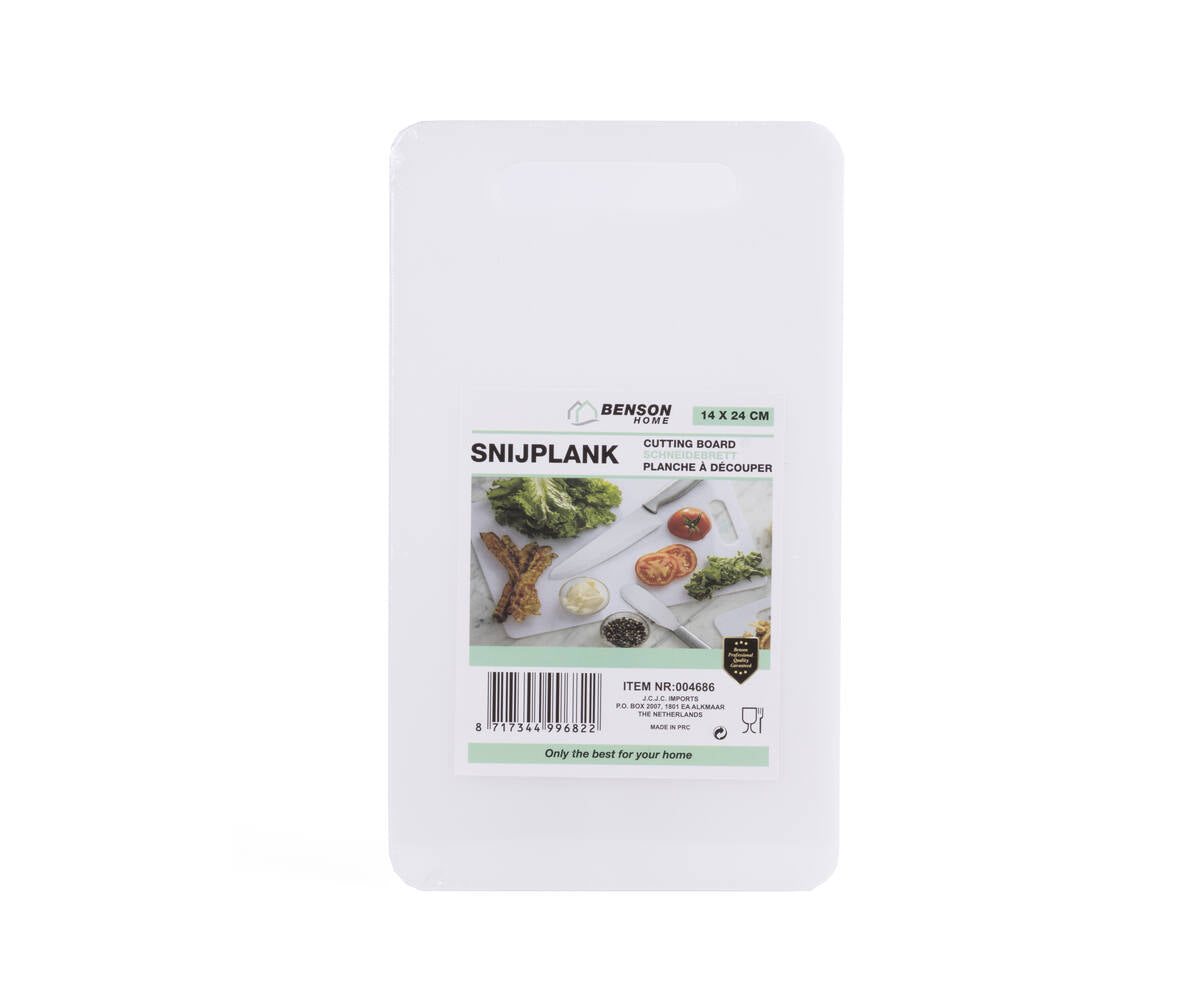 Ontdek de veelzijdige en duurzame snijplank van kunststof met een afmeting van 14 x 24 cm, perfect voor elke keuken. Deze snijplank biedt de ideale oplossing voor het veilig en gemakkelijk snijden van verschillende soorten voedsel, zonder het risico van beschadiging van je aanrecht of keukengerei.
